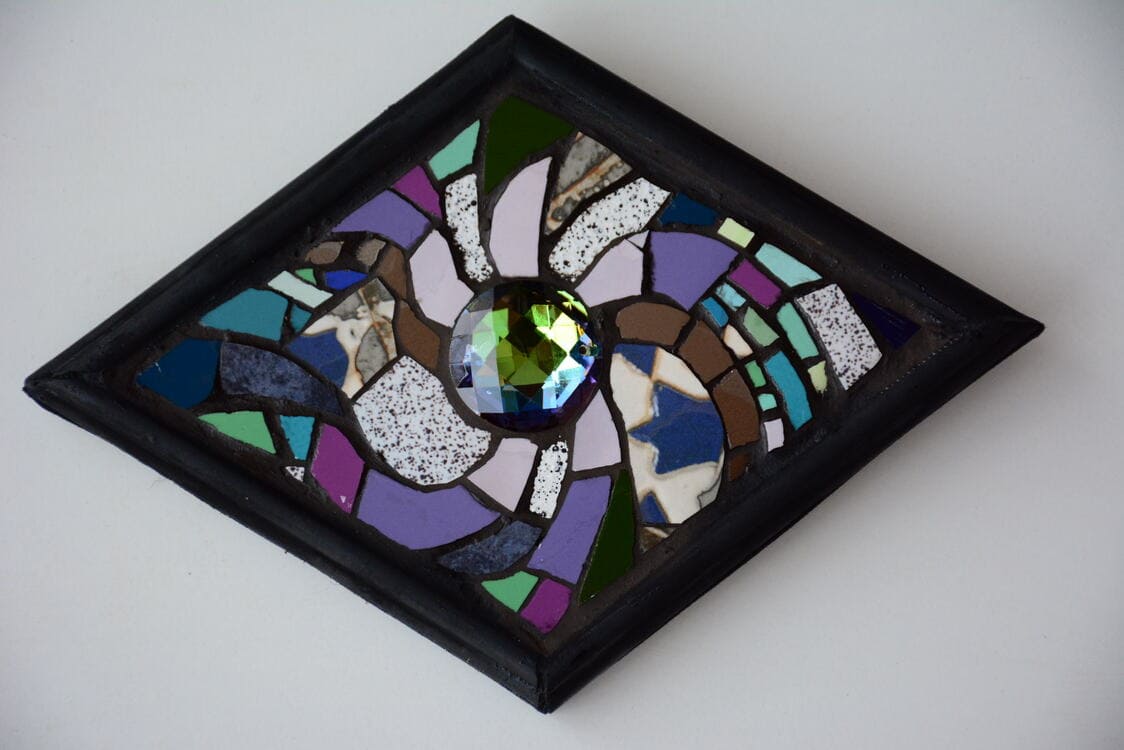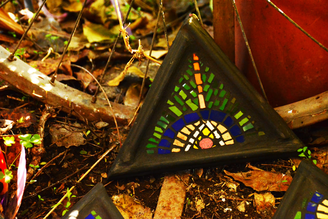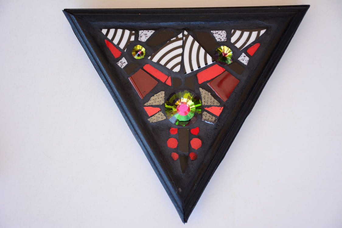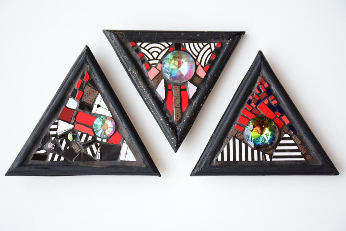 Figuras decorativas de mosaico en formas geométricas de multiples colores y tamaños.