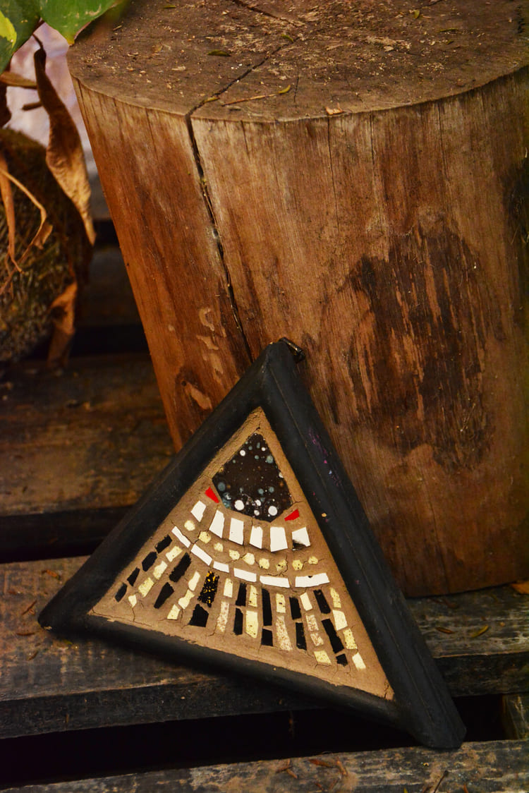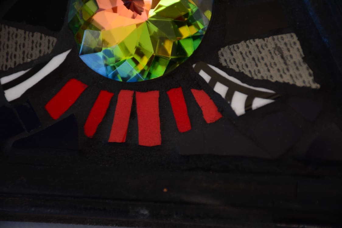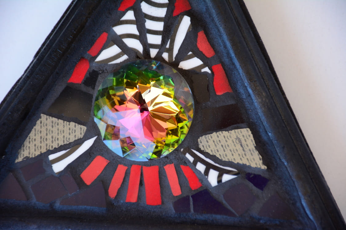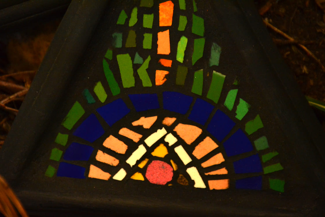 Figuras decorativas de mosaico en formas geométricas de multiples colores y tamaños.
